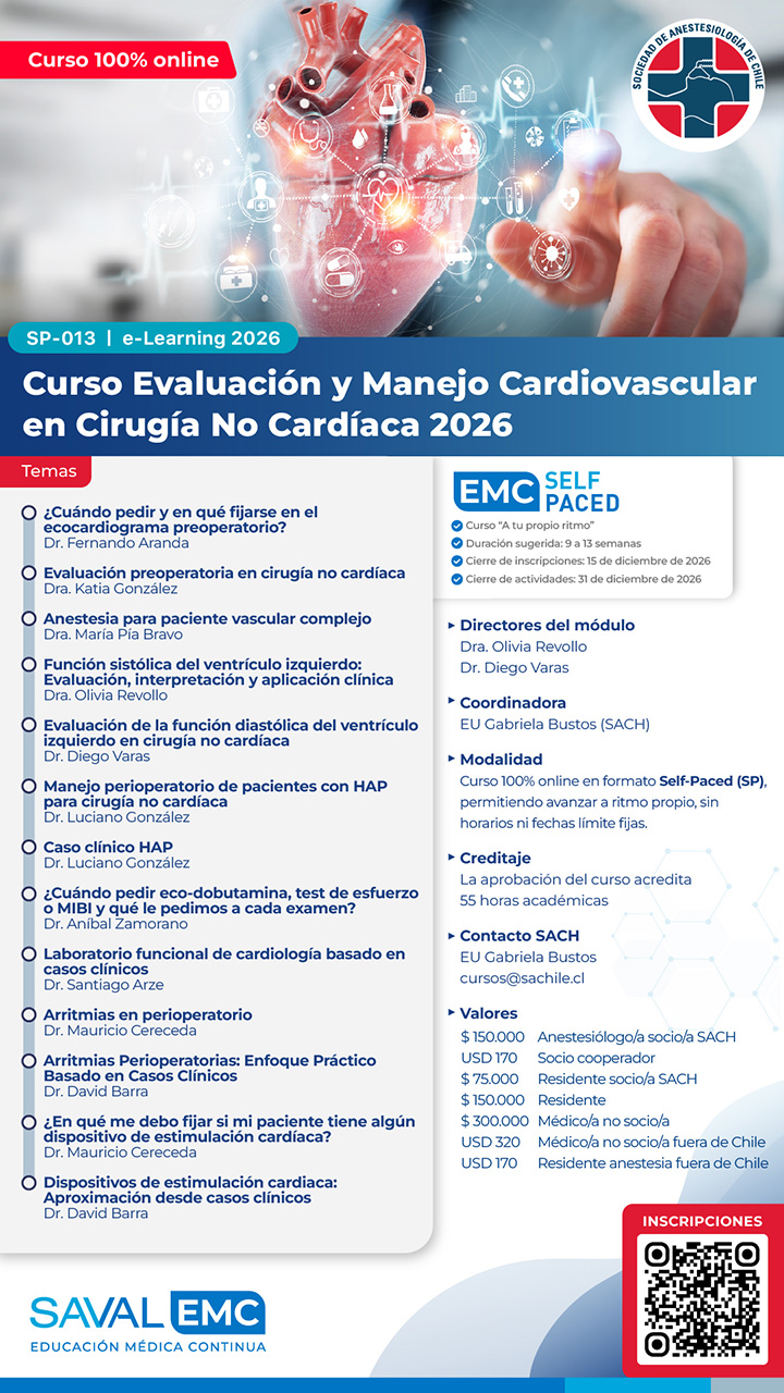 El Comité de Anestesiología Cardiovascular de la Sociedad de Anestesiología de Chile (SACH) organiza el curso “Evaluación y manejo cardiovascular de pacientes sometidos a una cirugía no cardíaca”, diseñado para actualizar y fortalecer los conocimientos en el manejo cardiovascular de pacientes complejos en el contexto quirúrgico. Este curso cuenta con certificación de la SACH y se imparte en modalidad online a través de la plataforma del Servicio de Educación Médica Continua de Laboratorio Saval, ofreciendo una formación flexible y de alta calidad.