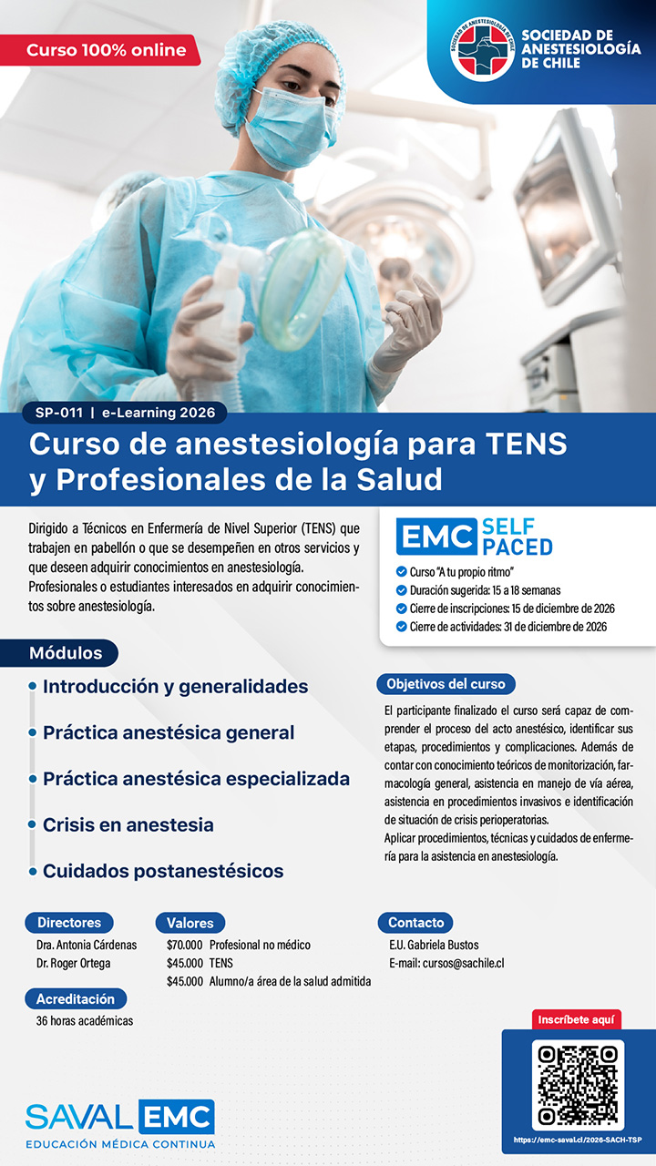 Curso teórico e-learning 100% online, en modalidad asincrónica self-paced ("a tu propio ritmo") y desarrollado por la Sociedad de Anestesiología de Chile, que aborda las principales temáticas que debe manejar un técnico de anestesia en apoyo del médico anestesiólogo.