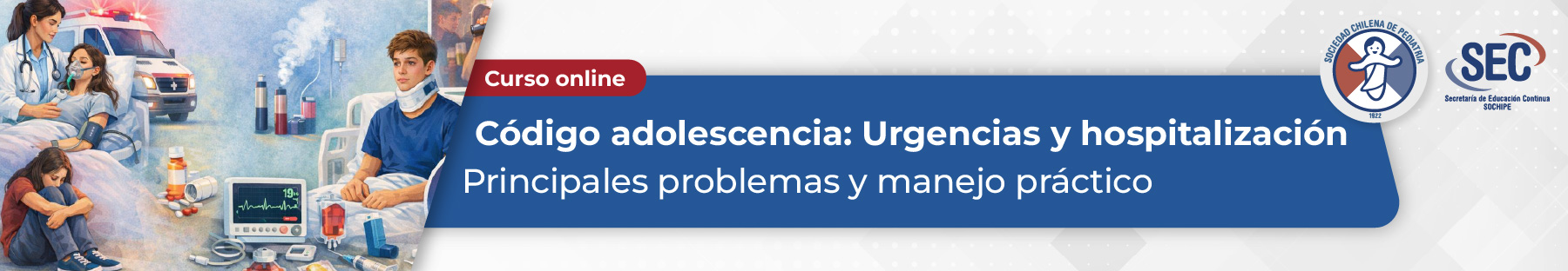 Curso de educación médica continua, dirigido a pediatras, médicos generales, médicos en formación, otros profesionales y equipos de la salud que trabajan en servicios de urgencia y con adolescentes hospitalizados. Está orientado a fortalecer la evaluación clínica, la toma de decisiones (triage/criterios de ingreso), la seguridad del paciente y el manejo integral biopsicosocial de los problemas más frecuentes en este grupo etario.